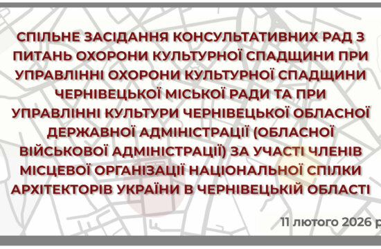 11 лютого 2026 р. відбулося спільне засідання консультативних рад з питань охорони культурної спадщини при управлінні охорони культурної спадщини Чернівецької міської ради та при управлінні культури Чернівецької обласної державної адміністрації (Обласної військової адміністрації) за участі членів Місцевої організації Національної спілки архітекторів України в Чернівецькій області. Під час засідання, Консультативні ради розглядали одне питання: «Внесення змін…