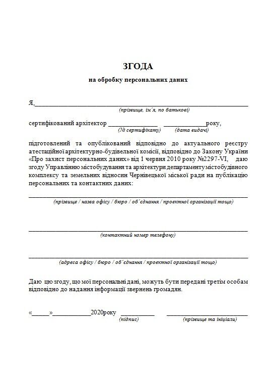 У зв’язку з чим просимо всіх атестованих архітекторів у Чернівецькій області надати інформацію до 01 лютого 2020 року до 203 кабінету Департаменту або за ел. адресою natali.arhitekt@gmail.com