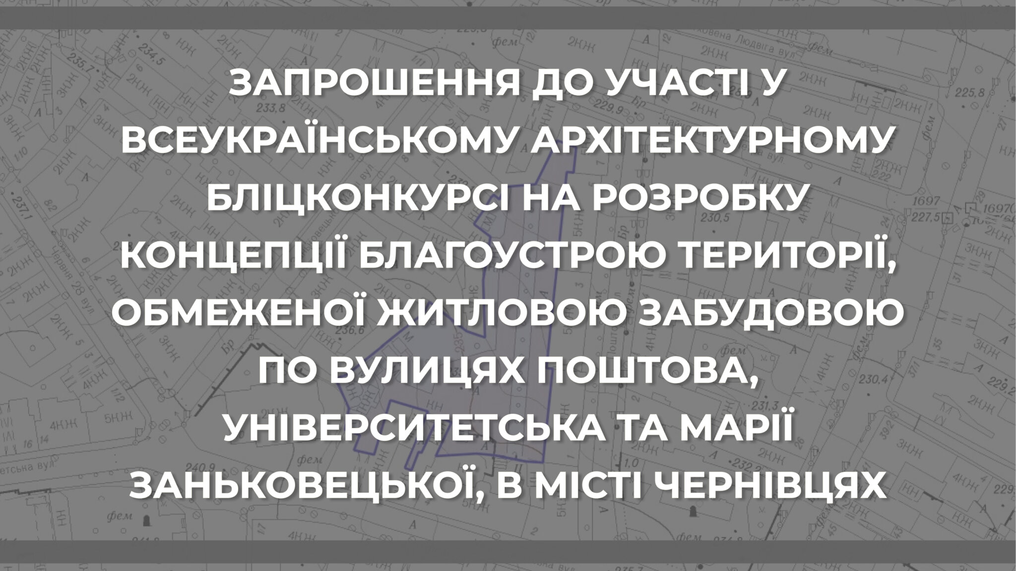 На підставі рішення виконавчого комітету міської ради від 23.09.2025 №493/24, департамент урбаністики та архітектури міської ради оголошує проведення Всеукраїнського архітектурного бліцконкурсу на розробку концепції благоустрою території, обмеженої житловою забудовою по вулицях Поштова, Університетська та Марії Заньковецької, в місті Чернівцях.